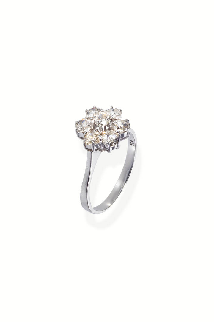 in oro bianco, sommità a margherita, con diamanti di vecchio taglio per totali ct1,50 ca (tre scheggiati)