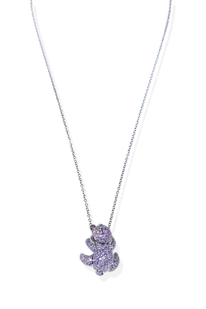 in oro bianco brunito, a forma di orsetto, con zaffiri metamerici per totali ct 3,80 ca