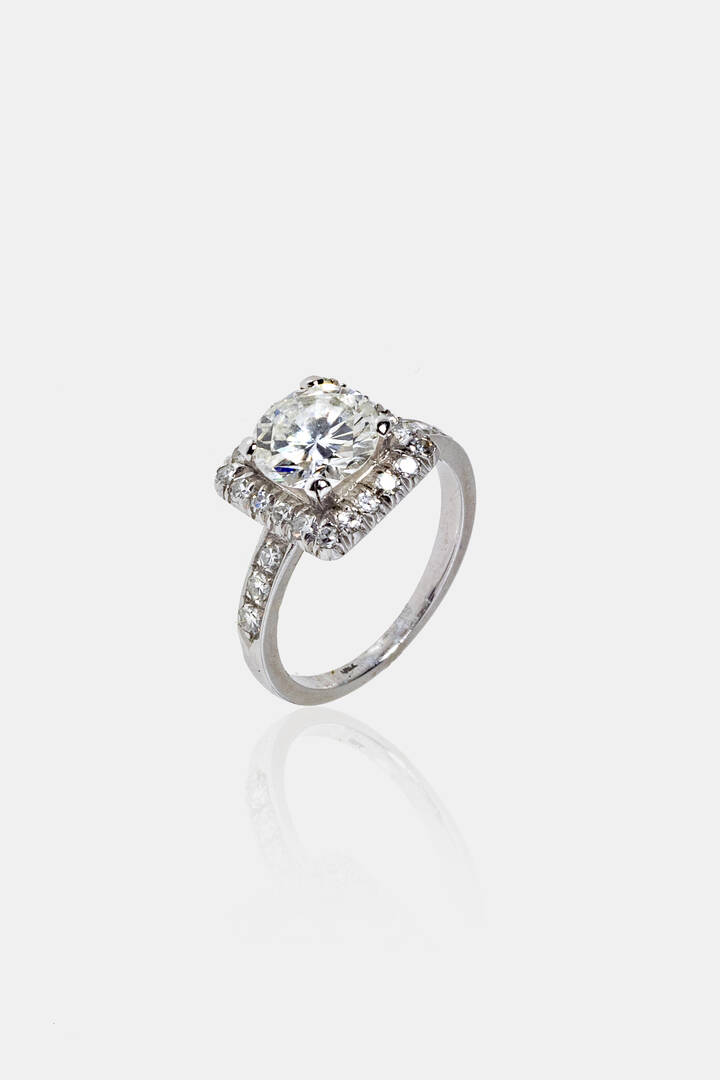 in oro bianco, con diamante solitario taglio brillante di 1,40 ca, probabile colore G, purezza VVS; diamanti taglio 8/8 per totali ct 0,30 ca, probabile colore G-H, purezza IF-VVS
