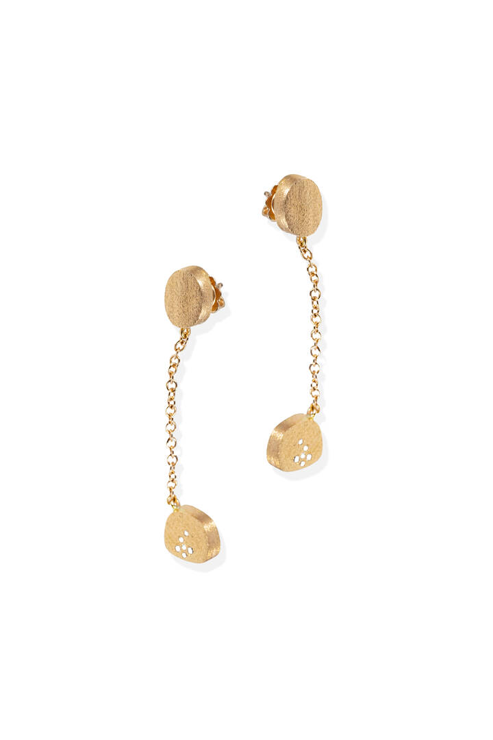 in oro rosa, con elementi geometrici satinati pendenti; diamanti taglio brillante per totali ct 0,07 ca, probabile colore G-H, purezza VVS