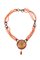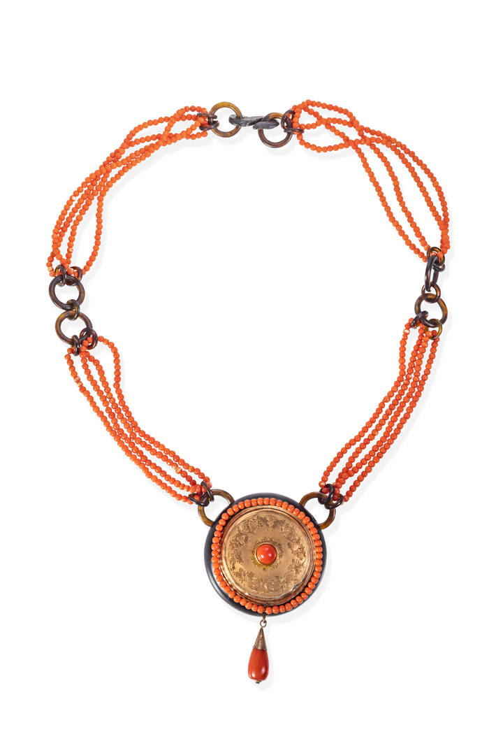composta da quattro fili di sfere di corallo rosso mediterraneo e nei toni del salmone del diam 3,5 ca; alternati a anelli in resina; al centro elemento rotondo in legno con contorno di sfere di corallo rosso e goccia di corallo rosso mediterraneo su cui è applicata una sottile lamina in oro 9 Kt.