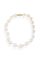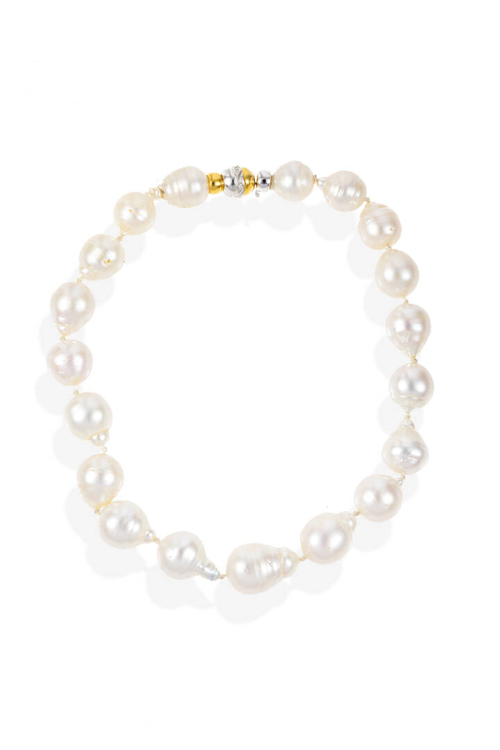 composto da un filo di perle australiane scaramazze del diam. di mm 12,5 a 14,5. Chiusura in oro giallo e bianco con diamanti taglio 0,05 ca. Presenti sei perle aggiuntive.