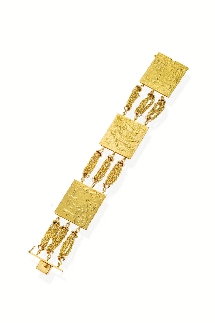 Bracciale in oro giallo, firmato "Unoaerre" composto da tre placche sbalzate con scene babilonesi, raccordate da catene con anelli terminanti in smalto policromo. Una catenina presenta una rottura.