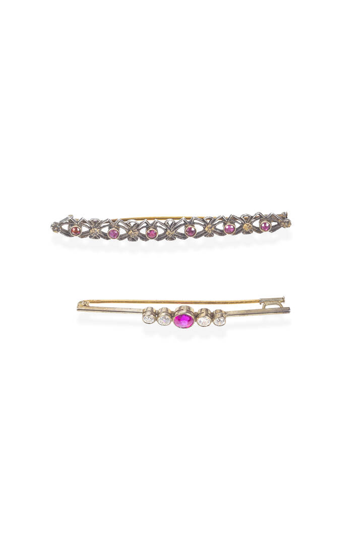 -a barretta. in argento e oro a bassa caratura, con sei rubini taglio rotondo, XX secolo. Peso gr 5,8