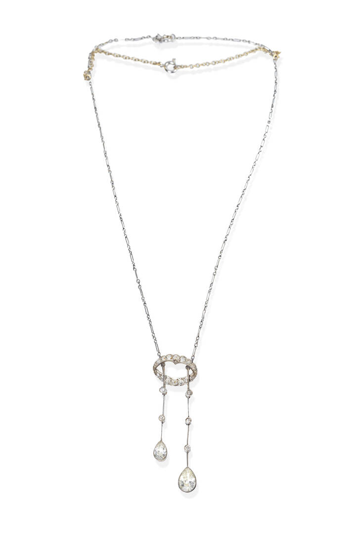 in oro bianco, XIX secolo, con elemento centrale in rosette di diamanti e diamanti taglio vecchio per totali ct 0,35 ca da cui dipartono due gocce di diamanti di vecchio taglio di ct 0,35 ca e 0,80 ca