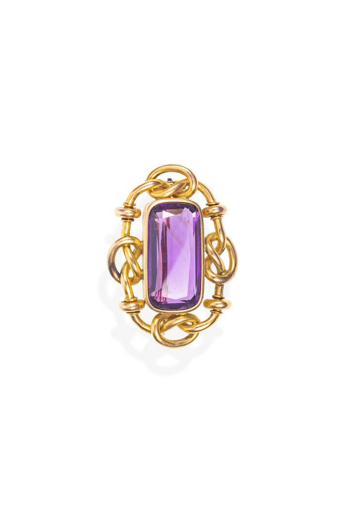 in oro giallo, XIX secolo, lavorata a canna vuota (difetti) al centro ametista taglio baguette di ct 20 ca