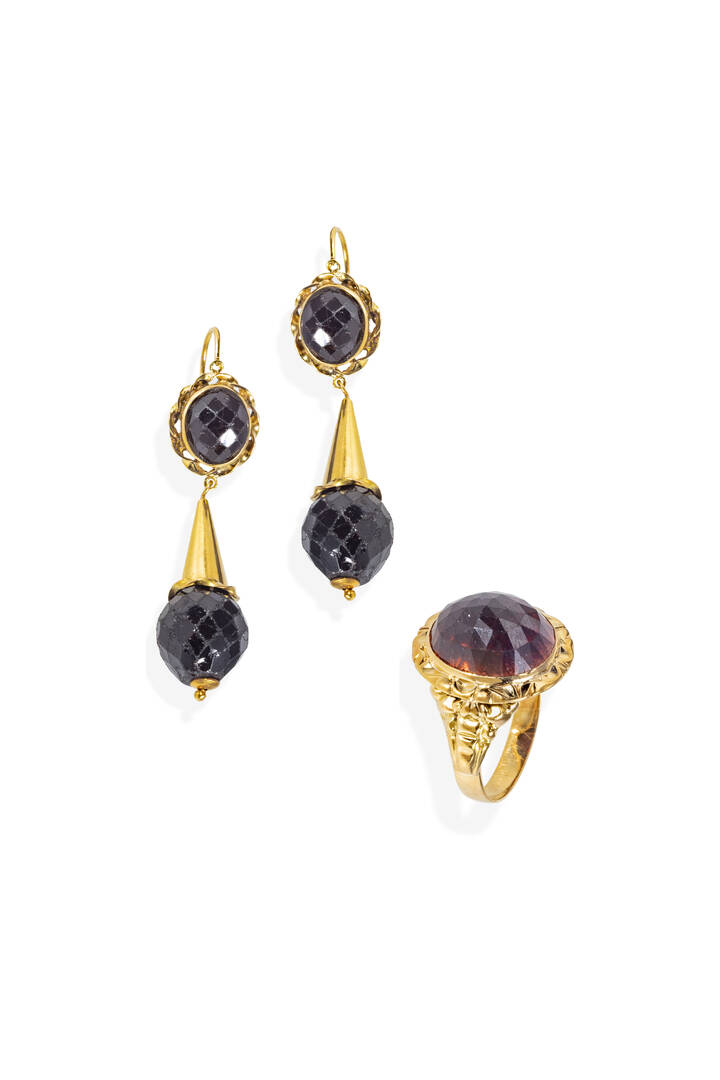 in oro giallo 14 Kt, Inghilterra XIX secolo, composta da anello e coppia di orecchini pendenti con granati briolette. Presenti rotture e difetti dei granati negli orecchini.