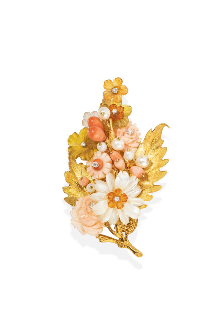 Spilla in oro giallo lucido e satinato, firmata "Minotto", a forma di ramo fiorito. Fiori e boccioli in corallo rosa e color salmone; in madreperla e quarzo citrino inciso; piccoli boccioli in perle. Diamanti taglio brillante per totali ct 0,10 ca