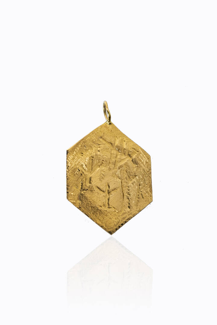 Ciondolo in oro giallo, di forma esagonale, firmato "Licata", fronte satinato inciso con motivi astratti. Esemplare unico