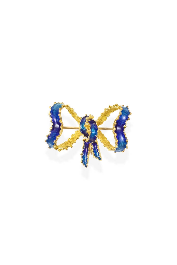 in oro giallo, a fiocco, con smalto blu. Punzonata "AL418"