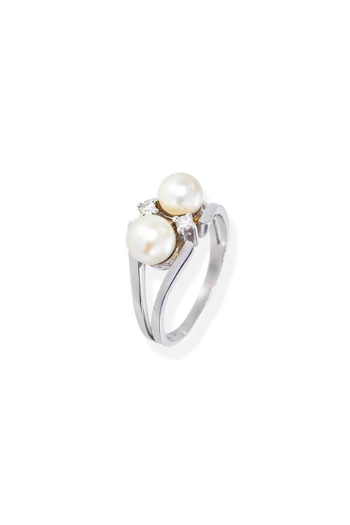 in oro bianco, sommità con due perle giapponesi del diam. di mm 5,7 e 6,2 ca e due piccoli diamanti taglio brillante per totali ct 0,06 ca.