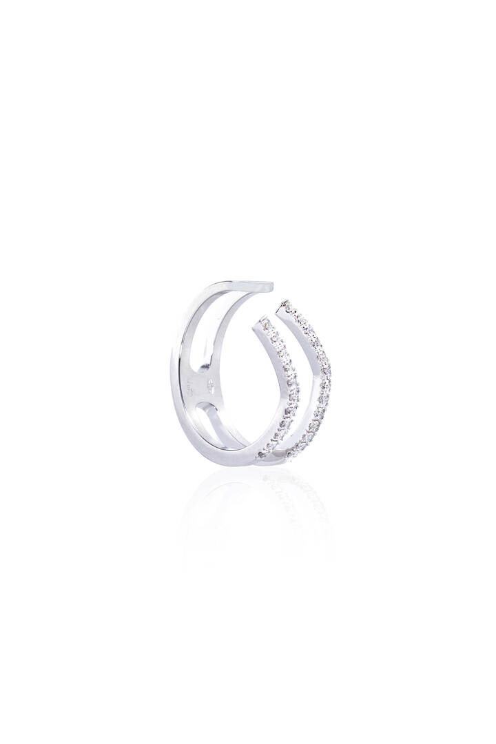 in oro bianco, composto da due fasce mosse e con linee spezzate in diamanti taglio brillante per totali ct 0,20 ca, probabile colore G-H, purezza IF-VVS