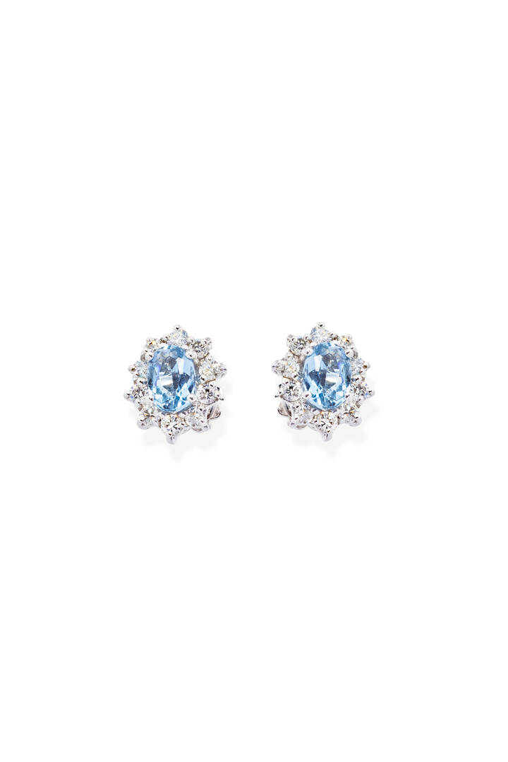 in oro bianco, a margherita, con al centro acquamarine taglio ovale per totali ct 2,80 ca e contorno di diamanti taglio brillante per totali ct 0,90 ca, probabile colore G-H, purezza VS