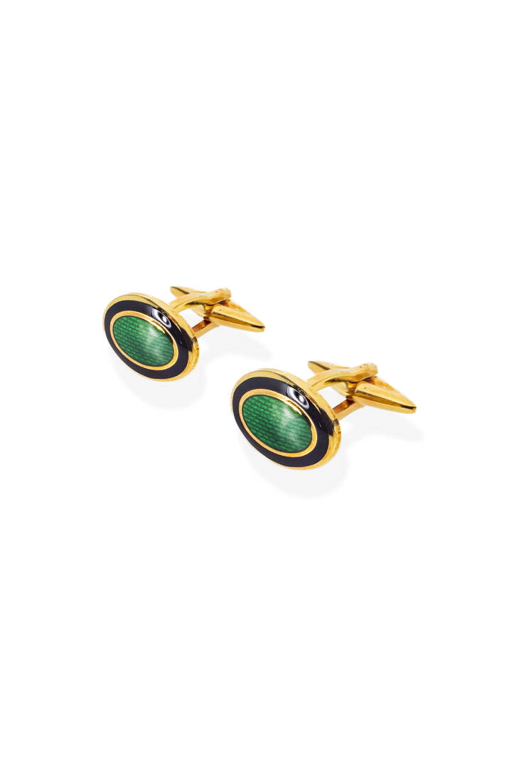 in oro giallo, di forma ovale, con smalti neri e verdi. Marcati "Mossini", "538 FI"