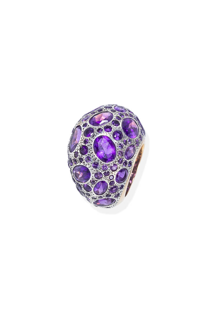Anello in oro rosa ed argento, firmato "Pomellato", modello "Tabou", con sommità bombata e impreziosita da ametiste taglio ovale e rotondo