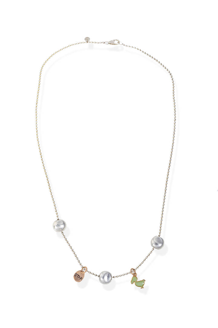Catena "Everyday" in argento 925/1000, marcata "Pomellato", linea "Dodo"; con al centro tre pepite in argento 925/1000, un ciondolo in oro rosa 9 Kt a forma di Dodo in smalto verde e una medaglia in oro 9 Kt della linea Dodo recante la scritta "Star".