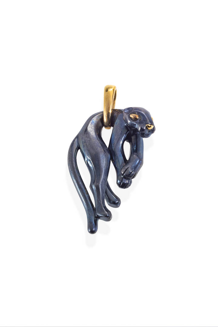 Ciondolo in argento brunito, firmato "Cartier", a forma di pantera. Occhiello in oro giallo.