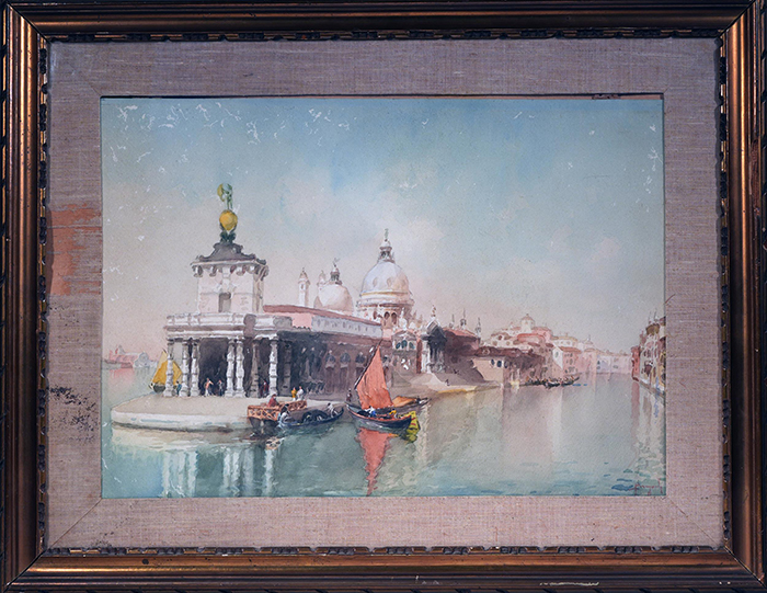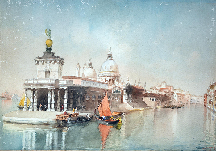 Brugnoli Emanuele (Bologna, 1859 - Venezia, 1944) Basilica di S. Maria della Salute, Venezia acquerello su carta, cm 35,5x49 firmato in basso a destra: Brugnoli