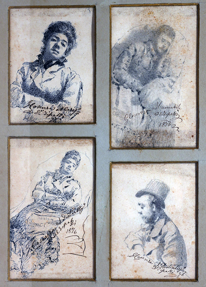 Cosenza Giuseppe (Luzzi, CS 1846 - New York 1922) a) Ritratto femminile china su carta, cm 9x6,5 firmato e datato in basso a destra: G. Cosenza 76 b) Bambino matita su carta, cm 11x7 firmato, datato e iscritto in basso al centro: G. Cosenza All'amabile... 76 c) Figura femminile china su carta, cm 11x7 firmato, datato in basso a destra: G. Cosenza 76 d) Profilo maschile matita su carta, cm 7x7 firmato e datato in basso a destra: G. Cosenza 76