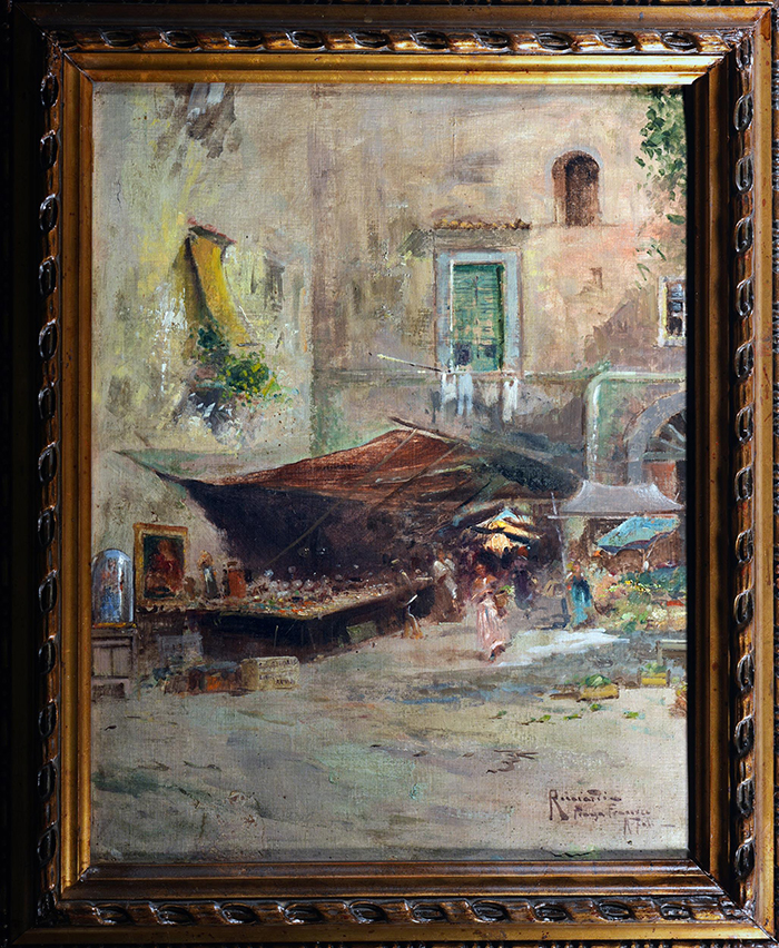 Ricciardi Oscar (Napoli 1864 - 1935) Piazza francese olio su tela, rip. su cartone, cm 49,5x38,5 firmato e iscritto in basso a destra Ricciardi Piazza francese, Napoli