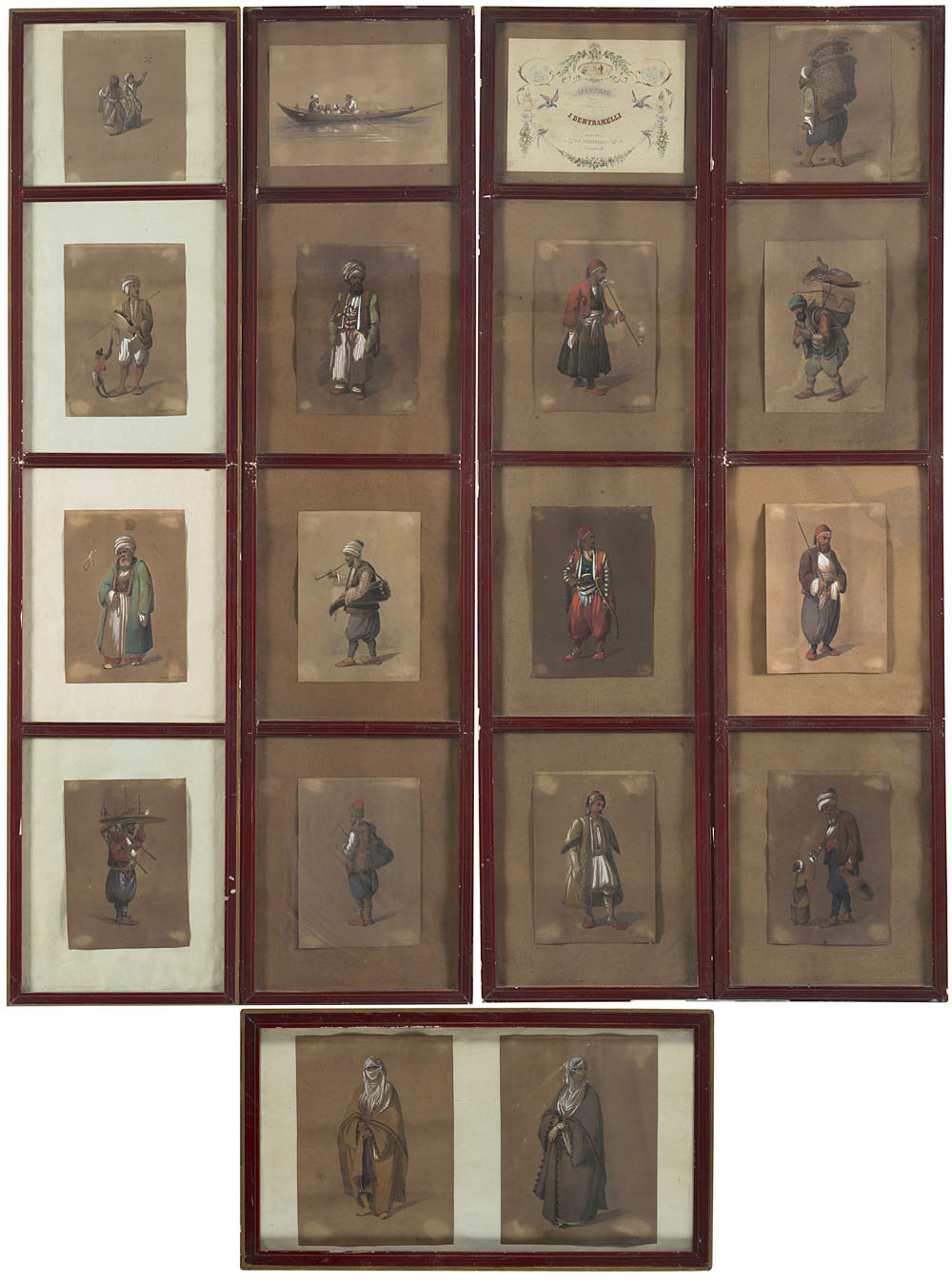 F. Perpignani (XIX secolo) - Gruppo di diciassette tecniche miste su carta raffiguranti "Personaggi turchi" e da una con la dedica a Mademoiselle J.Bertramelli (cm 16x21). In cinque cornici