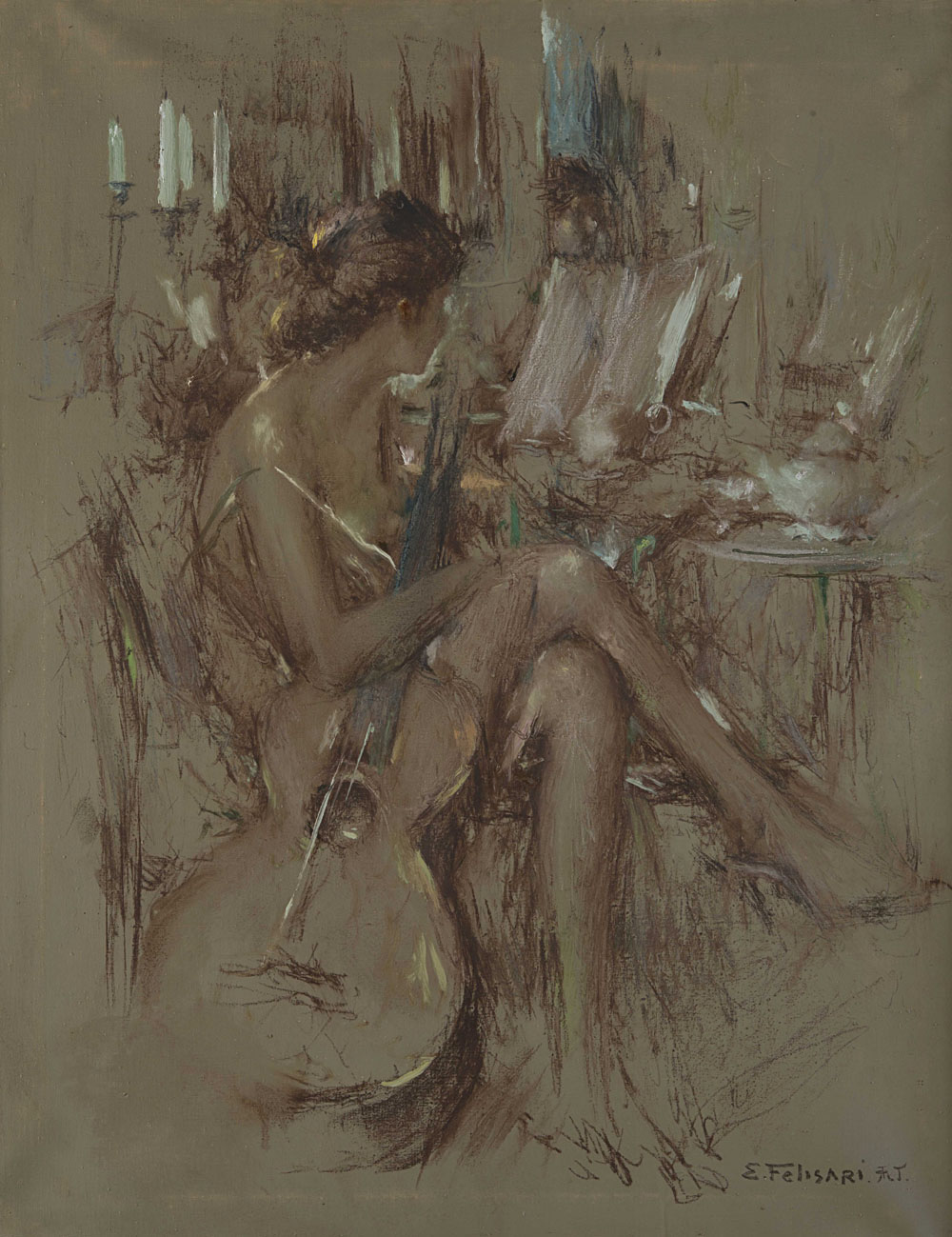 Enrico Felisari (Castelleone 1897 - 1981) - "Ragazza con chitarra" olio su tela (cm 75x60) Firmato in basso a destra Al retro: firma ed iscrizione autografa dell'artista; firma in arabo In cornice