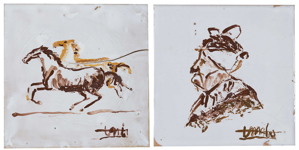 Cleto Tomba (Castel San Pietro 1898 - Bologna 1987) - "Cavalli in corsa" e "Figura" due piastrelle smaltate (cm 11x11) Firmate in basso a destra In cornici