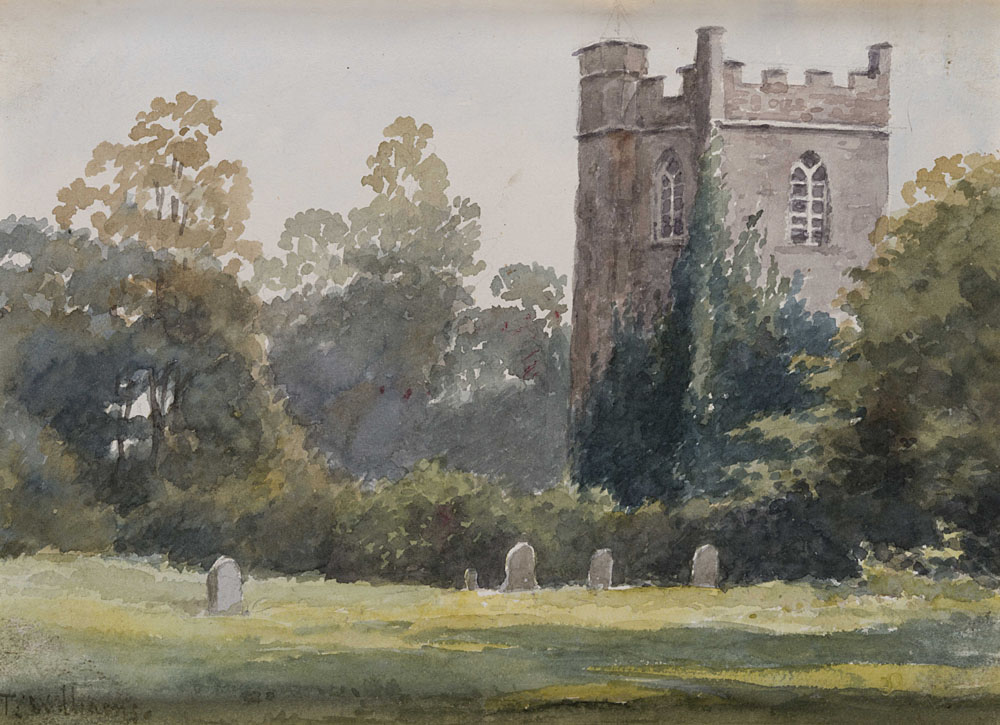 Terrick John Williams (Liverpool 1860 - Plymouth 1936) - "Scorcio di campagna inglese con torre" acquerello (cm 19x25.5) Firmato in basso a sinistra Al retro: acquerello raffigurante "Rametto con bacche" In cornice