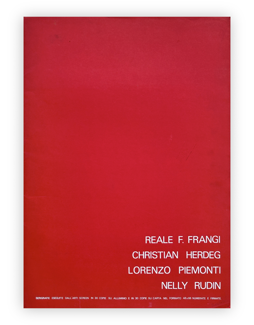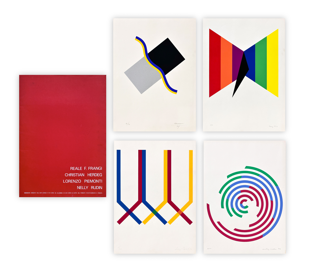 Cartella contenente 4 serigrafie di Reale Franco Frangi, Christian Herdeg, Lorenzo Piemonti e Nelly Rudin, ciascuna recante firma, datazione e numerazione (Esemplari 11/30) a matita al fronte ed etichetta di garanzia dello stampatore al retro
