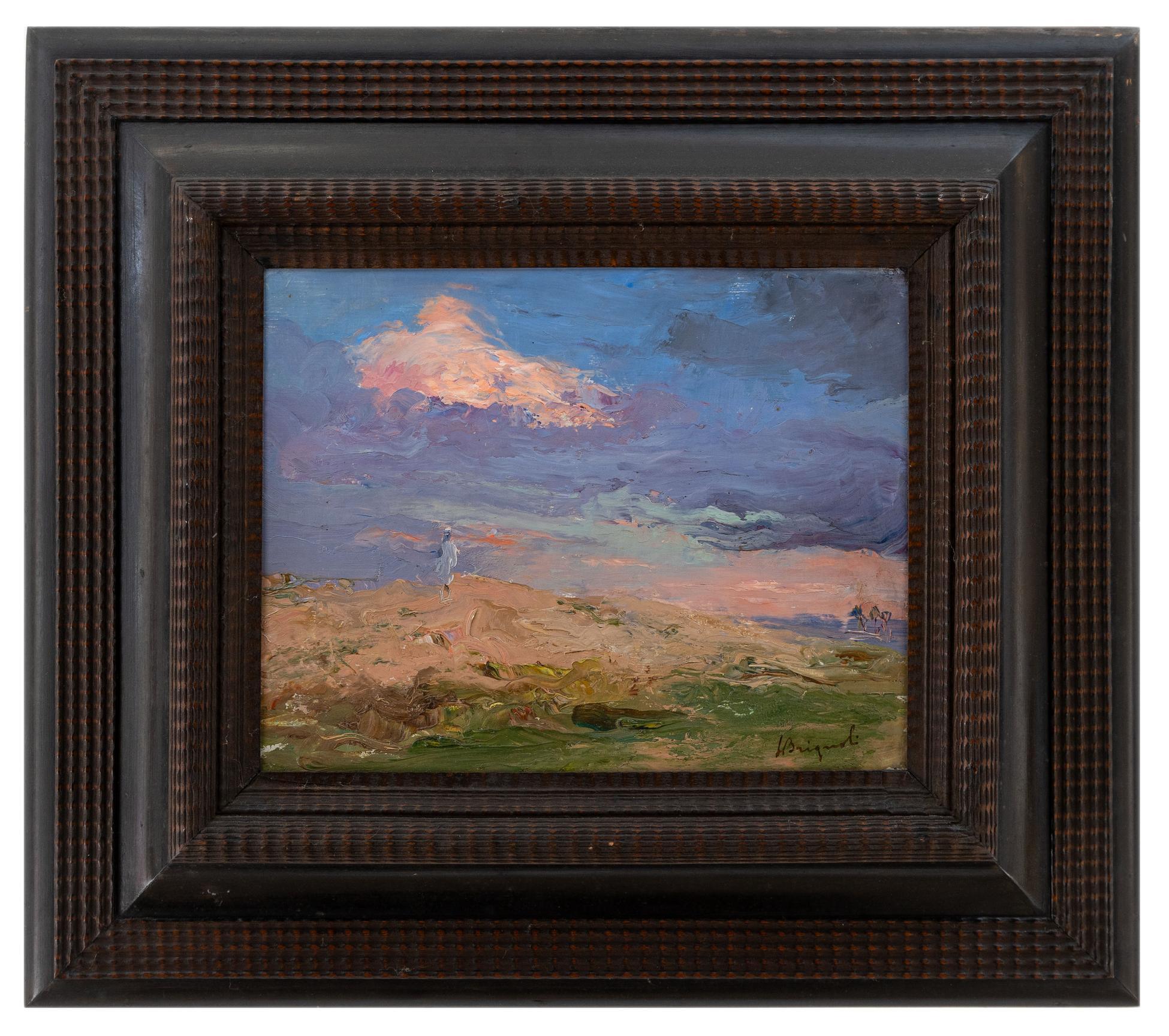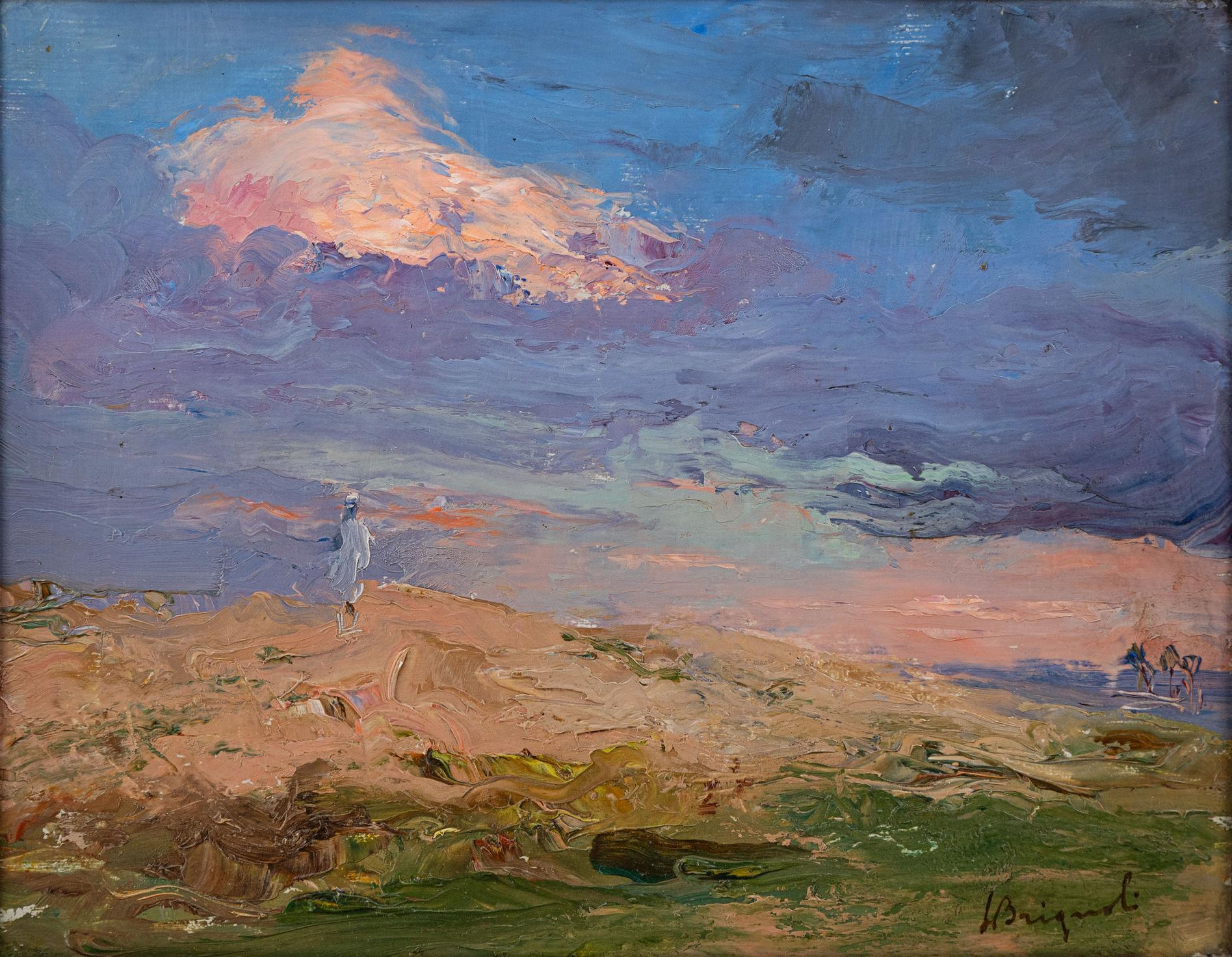 - Luigi Brignoli nacque il 18 aprile 1881 a Palosco, in provincia di Bergamo, e morì a Bergamo nel 1952. Dopo aver frequentato l'Accademia Carrara di Bergamo, dove fu allievo di Cesare Tallone e Ponziano Loverini, proseguì la sua formazione all'Accademia di Brera a Milano, che frequentò per due anni.La sua carriera artistica lo vide partecipare a numerose esposizioni. Nel 1907 prese parte alla VII Esposizione Internazionale d'Arte della Città di Venezia con il dipinto "Penombre". Nel 1918, durante la Biennale di Brera, presentò l'opera "1914", che gli valse la medaglia d'oro del Ministero della Pubblica Istruzione. Quest'opera, una rappresentazione simbolica dei lutti causati dall'invasione tedesca, fu acquistata dal governo belga e rimase esposta al Museo Reale di Bruxelles dal 1922 al 1930.Nel 1922, Brignoli intraprese un viaggio in Nord Africa, visitando l'Algeria e la Tunisia. Al suo ritorno, espose le opere realizzate durante il soggiorno africano al Circolo Artistico Bergamasco, ottenendo elogi sia dal pubblico che dalla critica. Nel 1926, succedette al suo maestro Ponziano Loverini nella direzione dell'Accademia Carrara di Bergamo, ruolo che mantenne fino al 1945, quando fu sostituito da Mario Sironi. Nello stesso anno, Brignoli sposò Anita Taramelli, compagna di viaggio in numerose sue esplorazioni artistiche, tra cui Belgio, Olanda, Sardegna e Africa.Oltre ai paesaggi, Brignoli si distinse come ritrattista, realizzando numerosi ritratti di notabili arabi. La sua pittura "africana" lo posiziona come pioniere di un tema che influenzò molti altri artisti bergamaschi, tra cui Giorgio Oprandi, Ernesto Quarti Marchiò e Romualdo Locatelli. Questi artisti, affascinati dal suo lavoro, intrapresero viaggi simili in Nord Africa, contribuendo all'espansione del movimento orientalista.Nel 1934, Brignoli organizzò una mostra personale intitolata "Tripolitania" al Circolo Artistico Bergamasco, presentando opere ispirate ai suoi viaggi in Africa. Nel 1942, partecipò a una mostra alla Permanente di Milano insieme ad altri artisti, tra cui Cugusiini e Della Foglia.Le opere di Luigi Brignoli sono state esposte in diverse sedi prestigiose, tra cui la Galleria Pesaro di Milano nel 1926, e hanno ricevuto riconoscimenti in mostre internazionali come quelle di Bruxelles e Buenos Aires nel 1911. La sua arte continua a essere apprezzata per la profondità emotiva e la precisione tecnica, offrendo uno sguardo intimo sulle culture e i paesaggi che ha rappresentato.