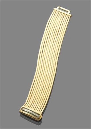 BRACCIALE Bracciale in oro giallo composto da dodici fili maglia "Londra" fermaglio con pavè di piccoli diamanti taglio brillante per complessivi ct 0,30 e piccoli smeraldi taglio rotondo Peso gr 102,00 yellow gold bracelet with "London" gold strands and closure composed of brillant cut diamond and round cut emerald pavé Weight 102.00 g