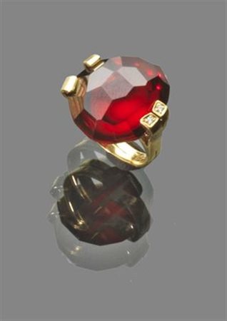 ANELLO Anello in oro giallo con grande granato sfacettato e due diamanti...