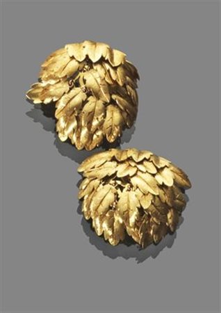 COPPIA DI ORECCHINI Coppia orecchini a clips in oro giallo con una cascata di foglie incise movibili Peso gr 38,60 pari of clip earrings in yellow gold with a cascade of etched movable leaves Weight 38.60 gr