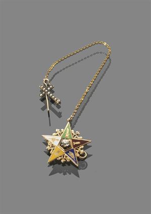 SPILLA Spilla a ciondolo in oro giallo a forma di stella con smalti e diamante vecchio taglio di ct 0,30 ca con catenella e pendente a forma di croce con perline Peso gr 5,70 (probabilmente simbolo massonico yellow gold star shaped brooch with enamel, antique cut diamonds approx total 0,30 kt and chain with cross shaped pearl pendant. (thought to be a Masonic symbol) weight 5,70 gr