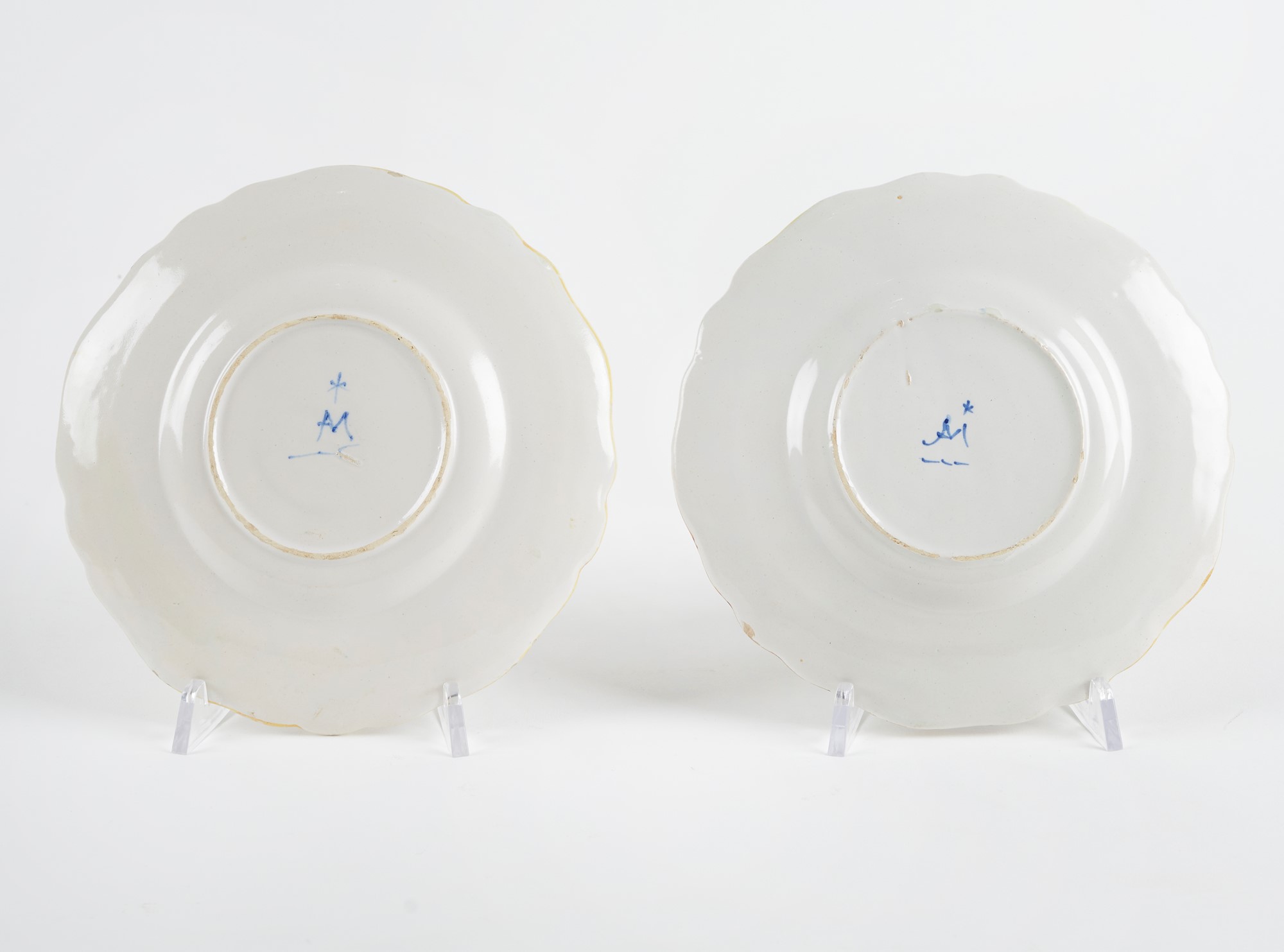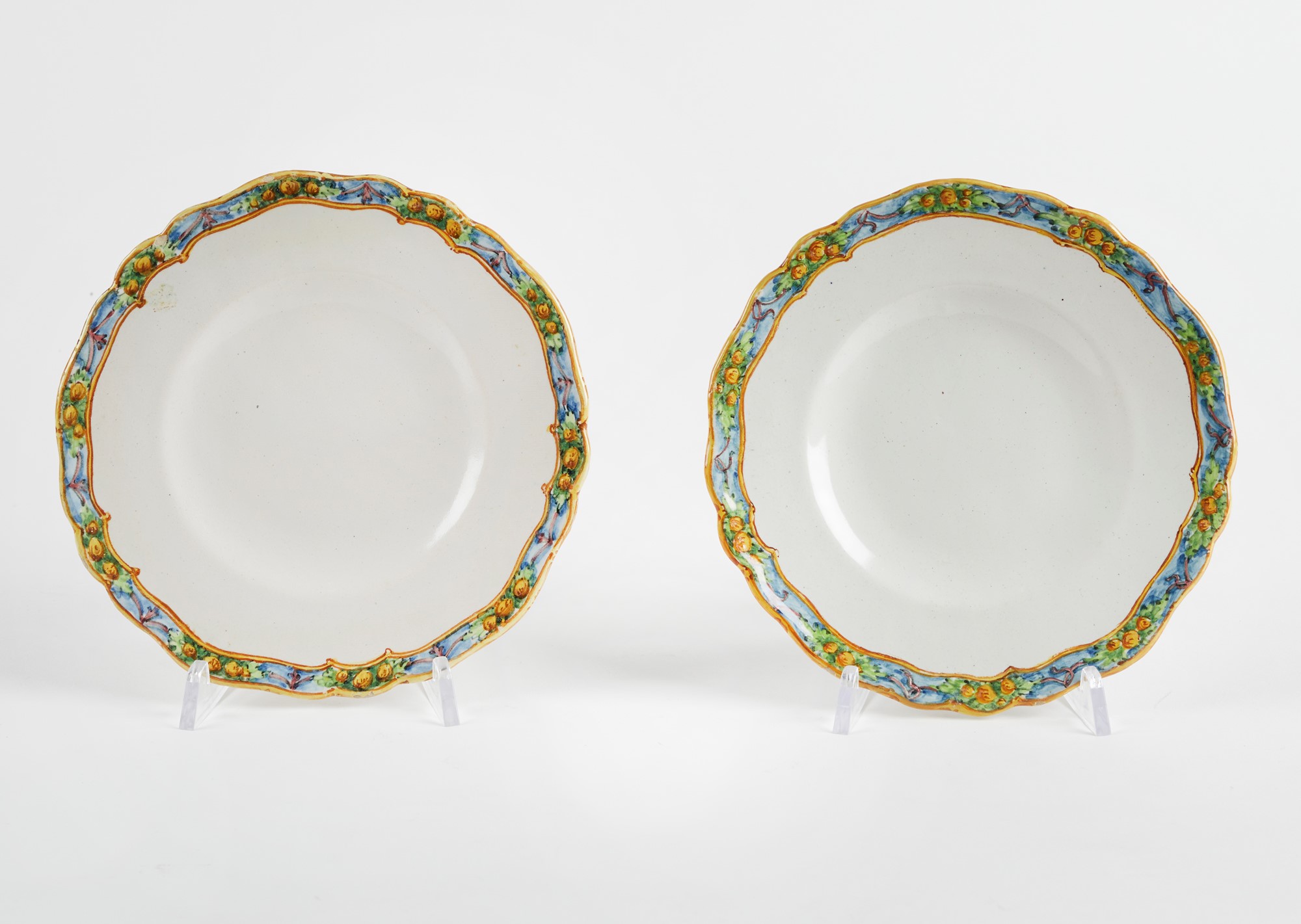 MANIFATTURA MINGHETTI Coppia di piatti in ceramica policroma, decorati con ghirlande di frutta sul bordo. 1890 circa. Cm 2x16. Al retro recano marchio AM. (lievi difetti) Accompagnati da certificato di autenticità di Bottegantica, Bologna.