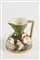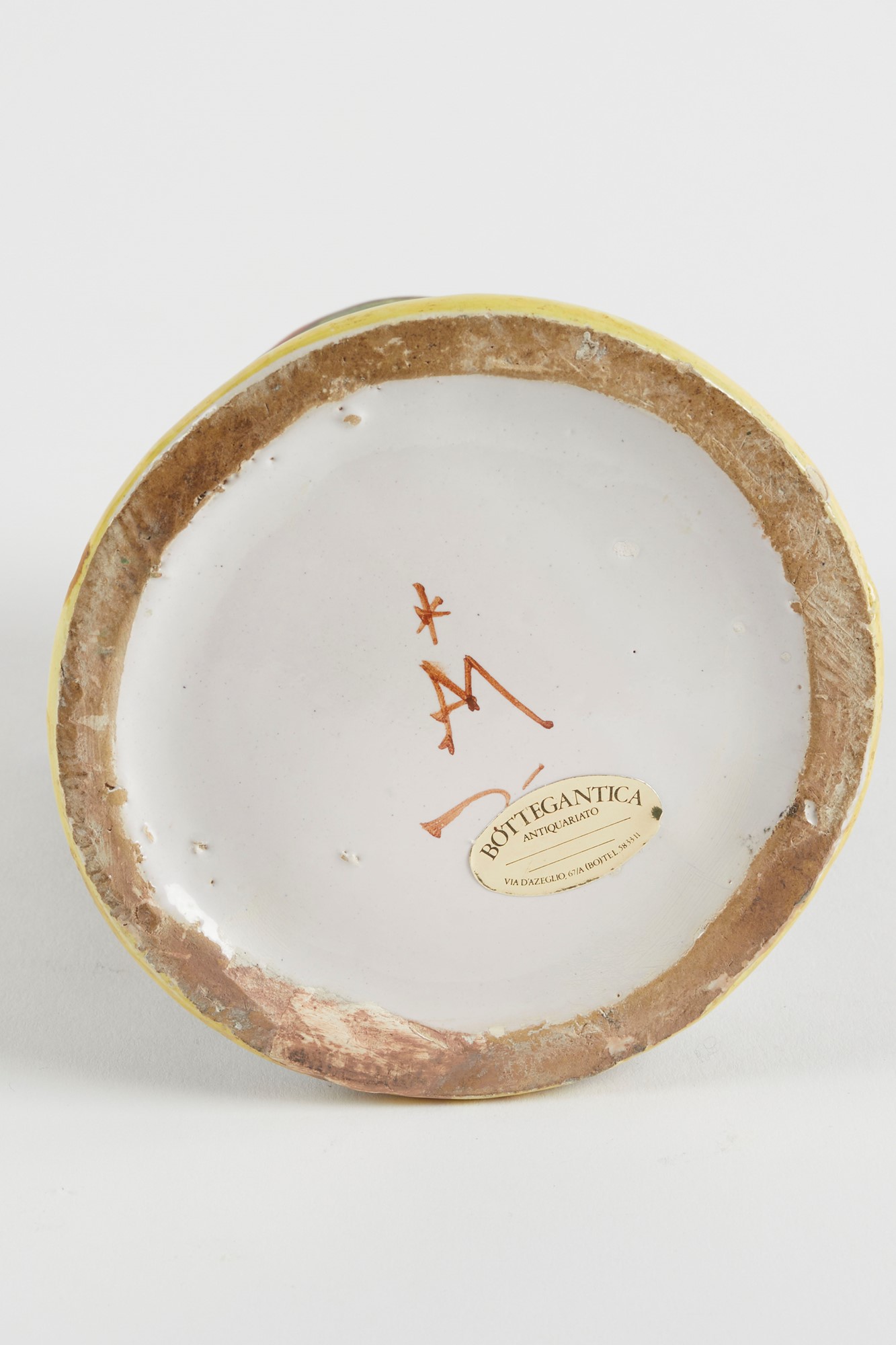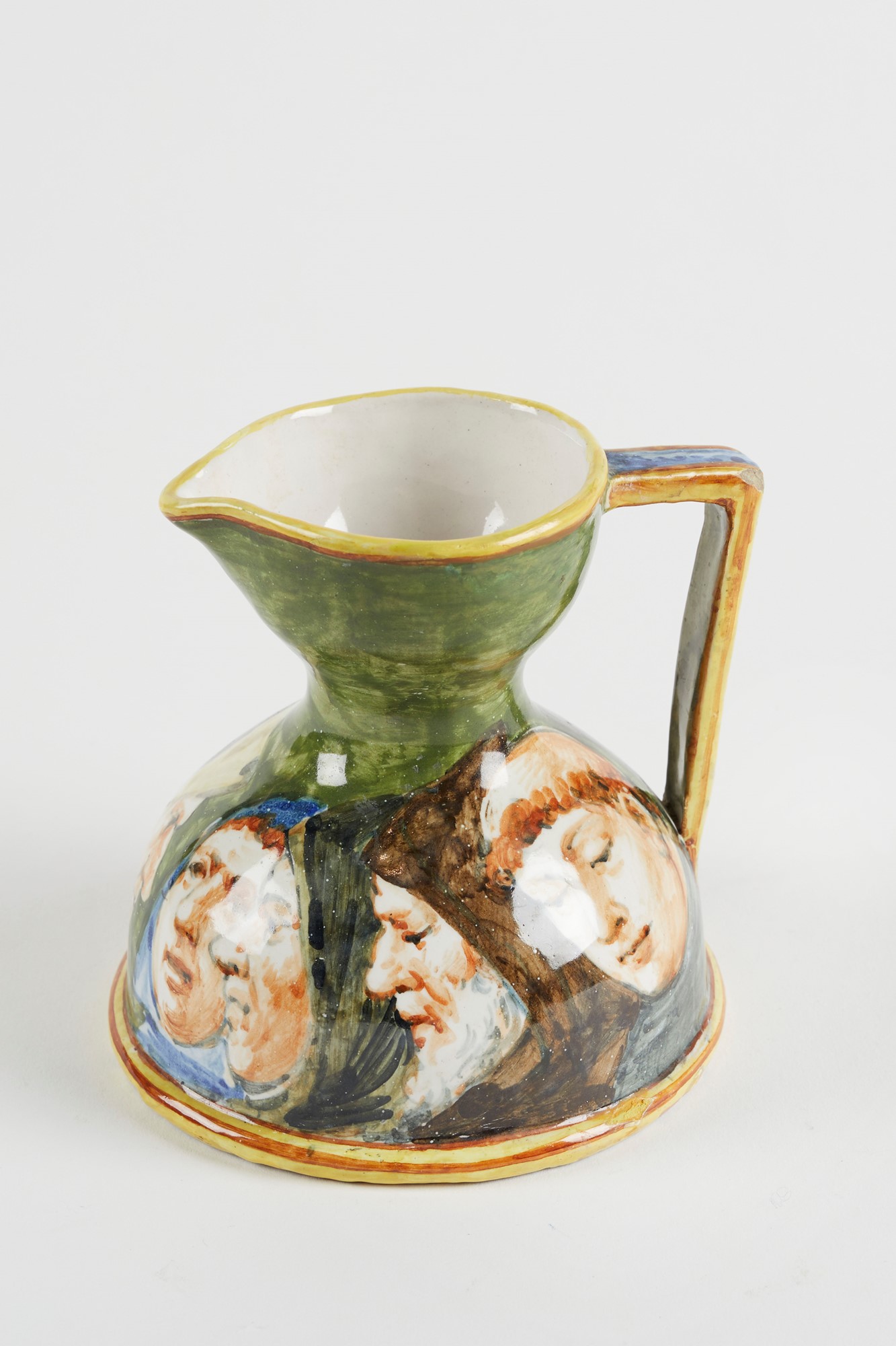 MANIFATTURA MINGHETTI Versatoio in ceramica policroma, decorato con figure di frati e suore. XX secolo. Cm 11x11x10. Al retro reca marchio AM. (lievi difetti)