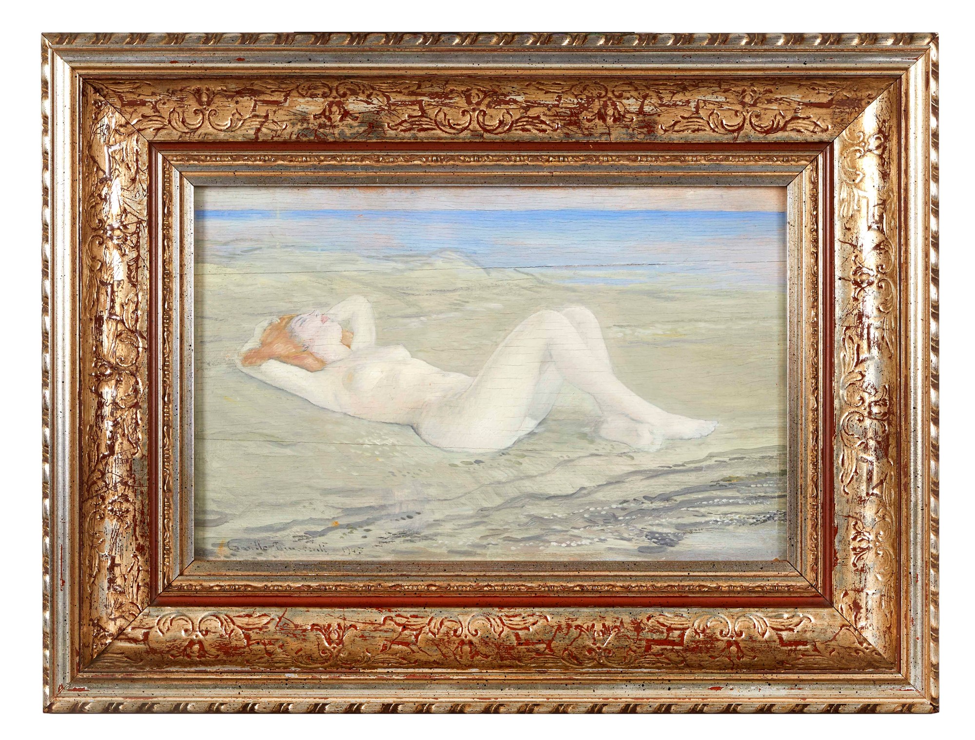 CAMILLO INNOCENTI (Roma 1871 - 1961) attr. “Fanciulla distesa”, 1945. Olio su tavola. Cm 21,5x34. Opera firmata e datata in basso a sinistra Camillo Innocenti 1945.
