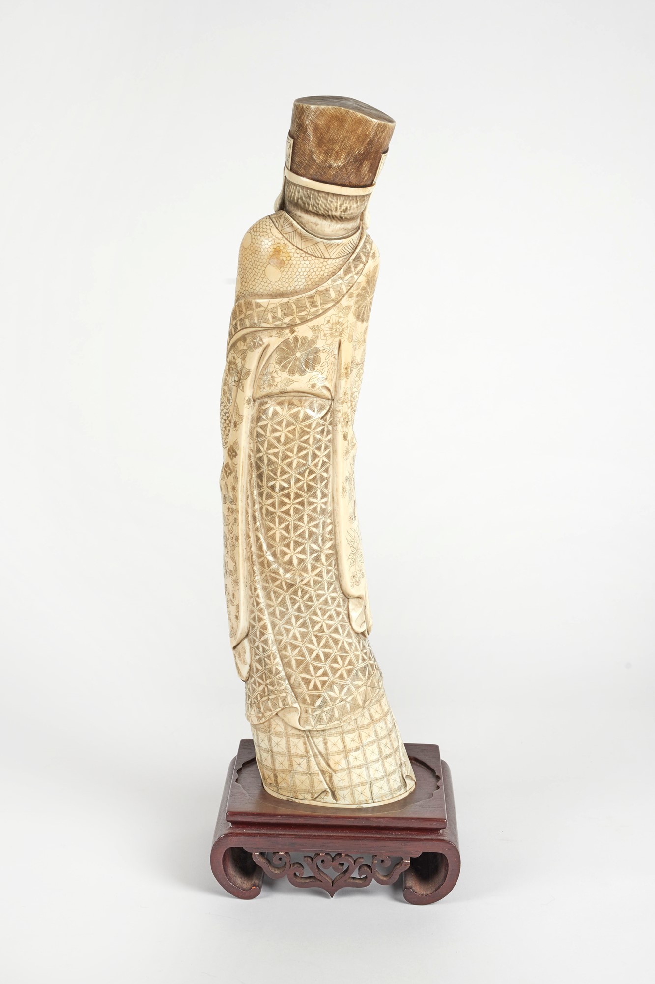 Scultura in avorio di elefante raffigurante anziano saggio con strumento musicale. Cina, inizi del XX secolo. Cm 44,5×12×8. Corredata di certificazione CITES.