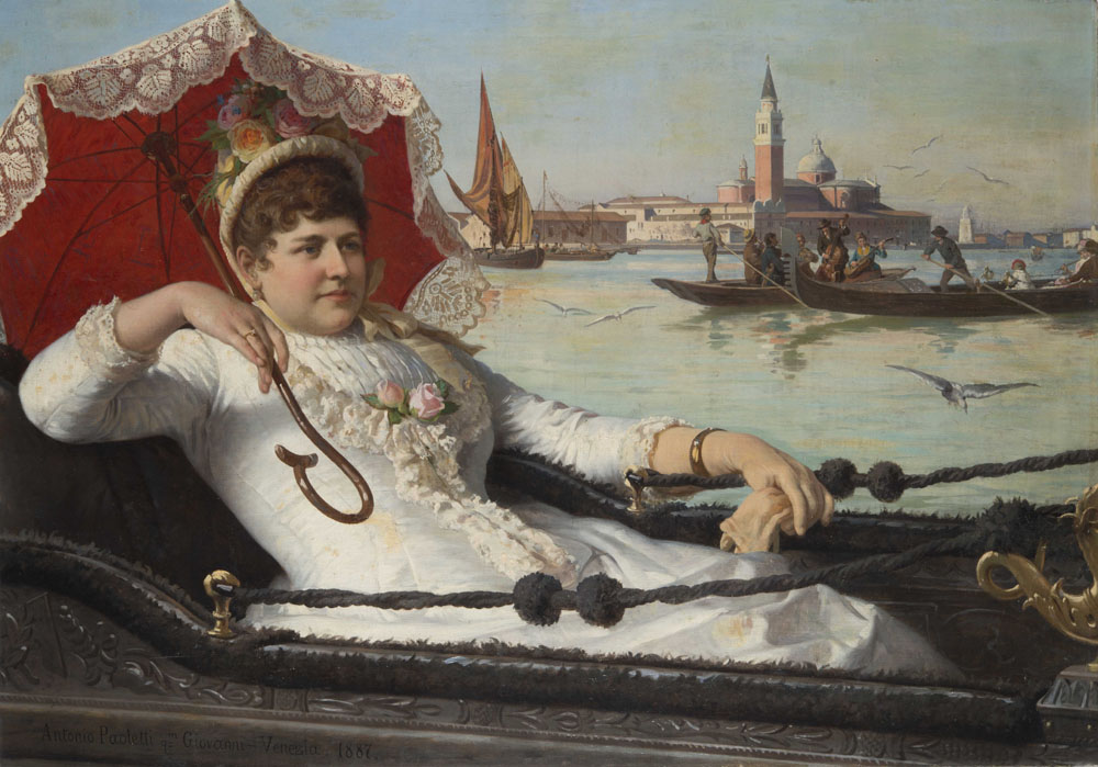 Antonio Ermolao Paoletti (Venezia 1834 - 1912) - "La signora in gondola con Venezia sullo sfondo" 1887 olio su tela (cm 71.5x102) Firmato, locato e datato in basso a sinistra In cornice