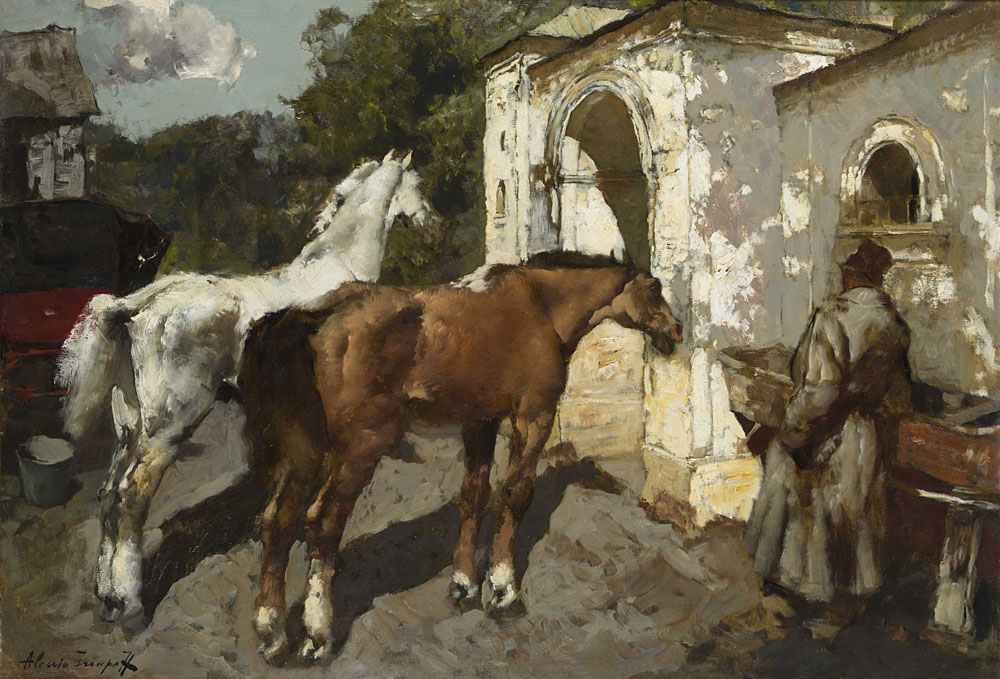 Alessio Issupoff (Vjatka 1889 - Roma 1957) - "Sosta all'abbeveratoio" olio su tela (cm 70x100) Firmato in basso a sinistra Provenzienza: Collezione Troubetzkoy In cornice
