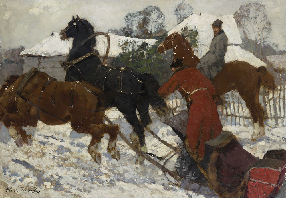 Alessio Issupoff (Vjatka 1889 - Roma 1957) - "Corsa con la slitta" olio su tela (cm 69.5x99.5) Firmato in basso a sinistra Provenzienza: Collezione Troubetzkoy (Lievi difetti) In cornice