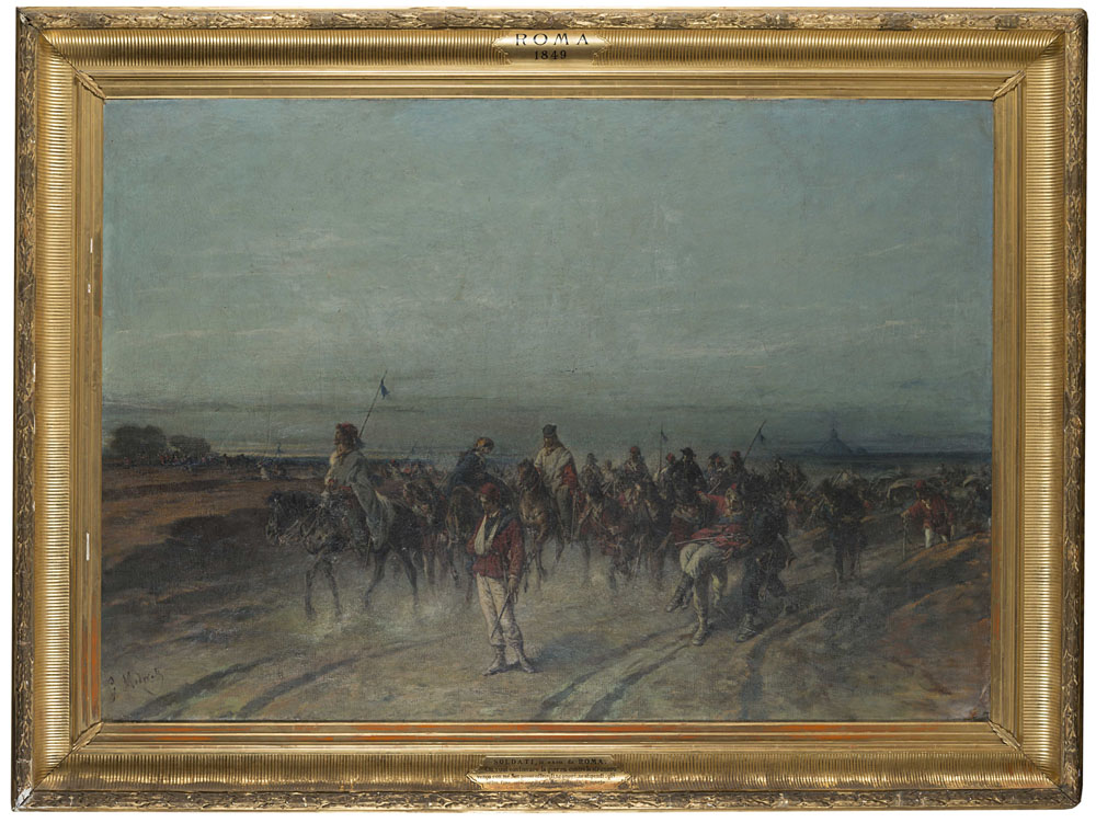 Giuseppe Modorati (Milano 1827 - Carate Brianza 1905) - "Soldati, io esco da Roma...Roma 1849" olio su tela (cm 140x200) Firmato in basso a sinistra In cornice di legno dorato. Iscritto sulla base, locato e datato nel cartiglio superiore (Difetti)