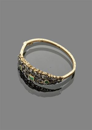 BRACCIALE Bracciale rigido in oro giallo ed argento con al centro motivi floreali con smeraldi e diamanti peso gr 21,60 Gold and silver bangle with a central floral motif with emeralds and diamonds weighing 21.60 grams