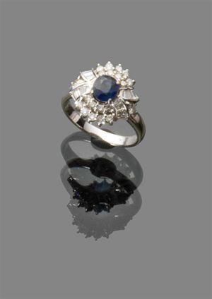 ANELLO Anello in oro bianco con zaffiro ovale ct. 0,75 circa contornato da diamanti taglio brillanti e taglio trapezio per complessivi ct. 0,96 circa colori G/H purezza IF/WWS peso gr. 4,80 white gold ring with center oval sapphire approx 0,75 kt surrounded by trapezoid shaped and brillant cut diamonds approx 0,96 kt with G/H color and IF/WWS clarity weight gr. 4.80