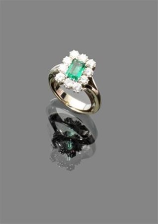 ANELLO Anello in oro bianco con smeraldo a forma rettangolare contornato di diamanti taglio brillante per complessivi ct 2,20 ca peso gr 10,20 white gold ring with rectangulare cut emerald surrounded by brillant cut diamonds approx total 2,20 kt weight of 10.20 grams