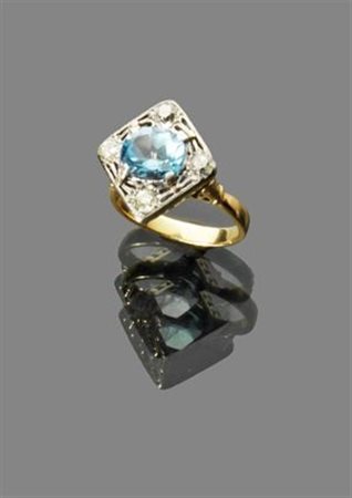ANELLO Anello in oro giallo e argento con topazio azzurro taglio ovale e 4 brillanti di taglio vecchio per complessivi ct 0,60 ca periodo fine XIX sec. peso gr 7,70 yellow gold ring with oval blu topaz surrounded by 4 antique cut diamonds approx total 0,60 kt late XIX century weight 7,70 gr