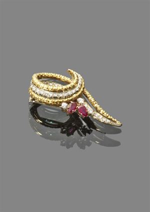 SPILLA Spilla in oro giallo con due rubini taglio goccia e tre diamanti taglio brillante per complessivi ct 0,22 ca e diamanti taglio 8/8 per complessivi ct 0,70 ca Peso gr 12,00 brooch in yellow gold with two teardrop cut rubies and three brillant cut diamonds totaling 0,22 kt and 8/8 cut diamonds total approx 0,70 kt Weight 12.00 gr