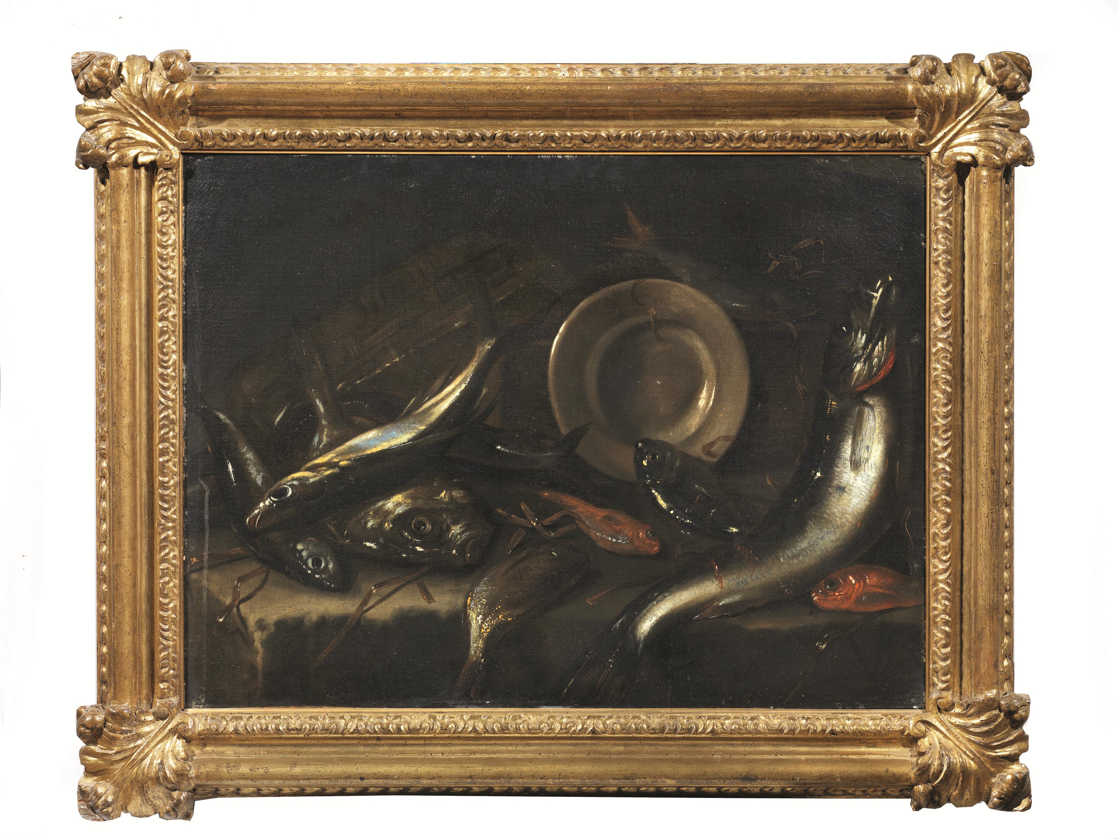 Ambito di Giuseppe Recco, sec. XVIINATURA MORTA CON PESCI E PIATTO IN...