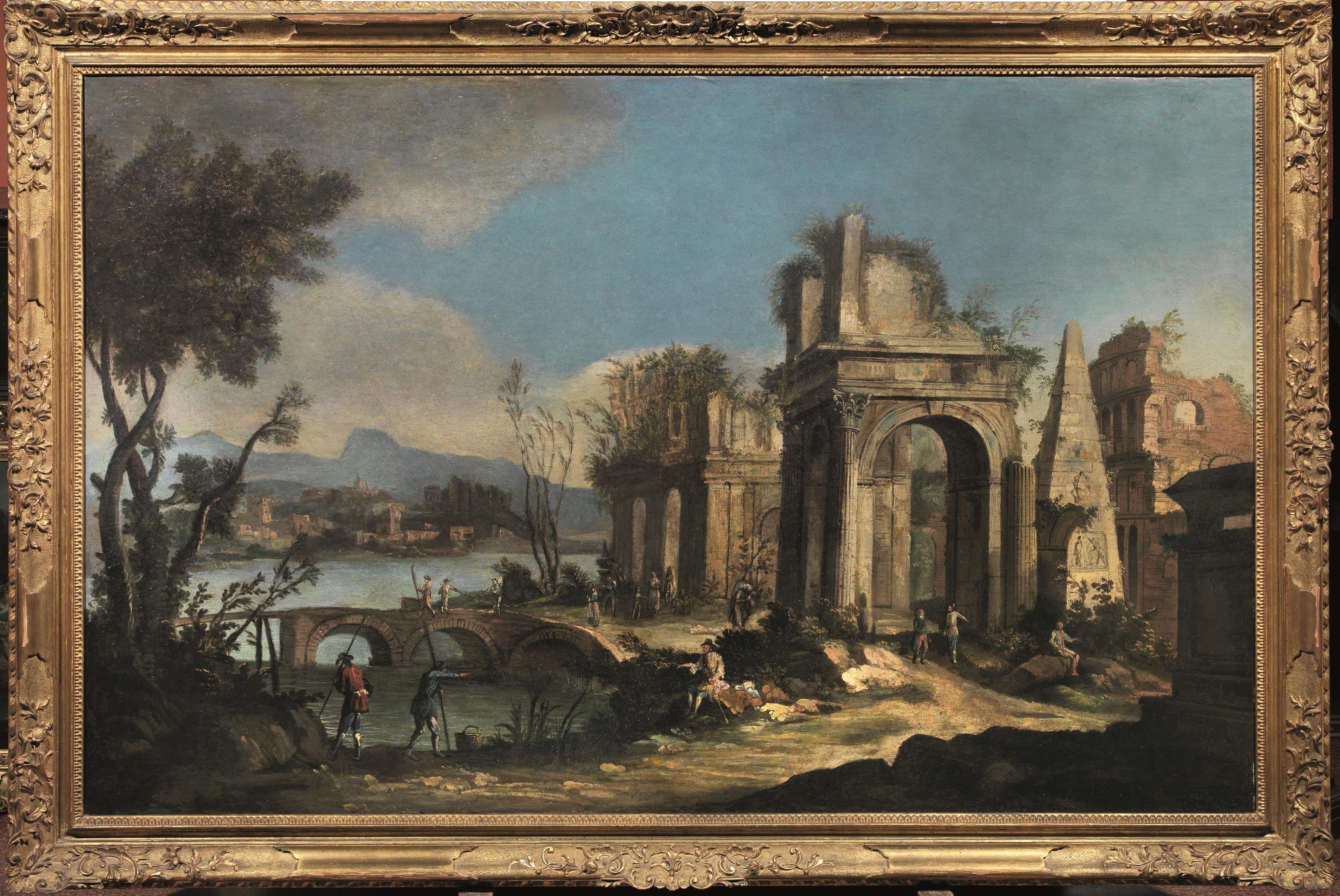 Scuola veneta, sec. XVIIIPAESAGGIO FLUVIALE CON ROVINE CLASSICHE E FIGUREolio...