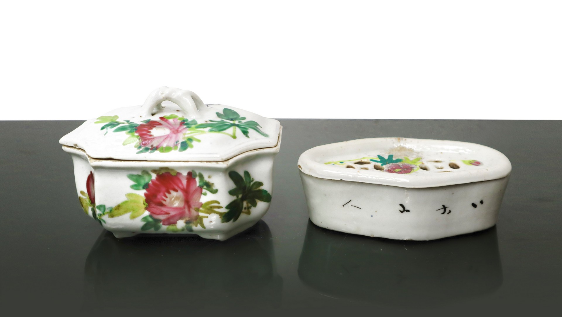 Brucia profumo e scatola cinese h cm 4 x cm 10; h cm 7 x cm 11 Con decori floreali. Piccole mancanze e segni d'uso
